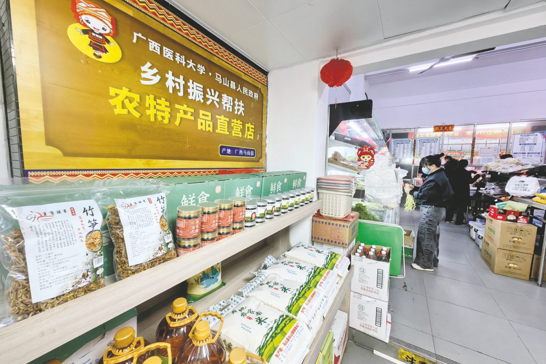 在广西医科大学,教职工到直营店购“土货”已成常态。该校党委组织部副部长张孟见介绍,作为后盾单位,学校不仅无偿提供经营场地,还将直营店纳入教职工福利体系,通过“以购代捐”实现双向受益,“这让农户销路不愁,也让教职工吃得放心”。