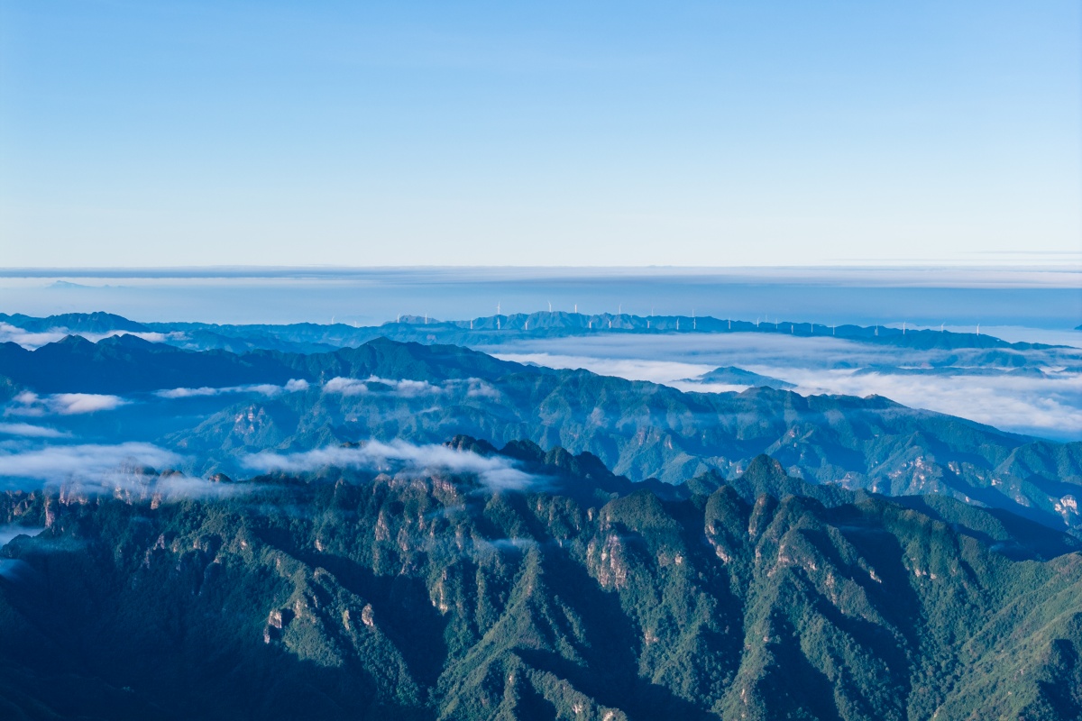 11月6日,来宾市象州县百丈乡一带山脊上的百丈风电场,数十台大型风电机组迎风旋转。山间晨雾缭绕,与层峦叠嶂的群山相映成景,场面蔚为壮观。