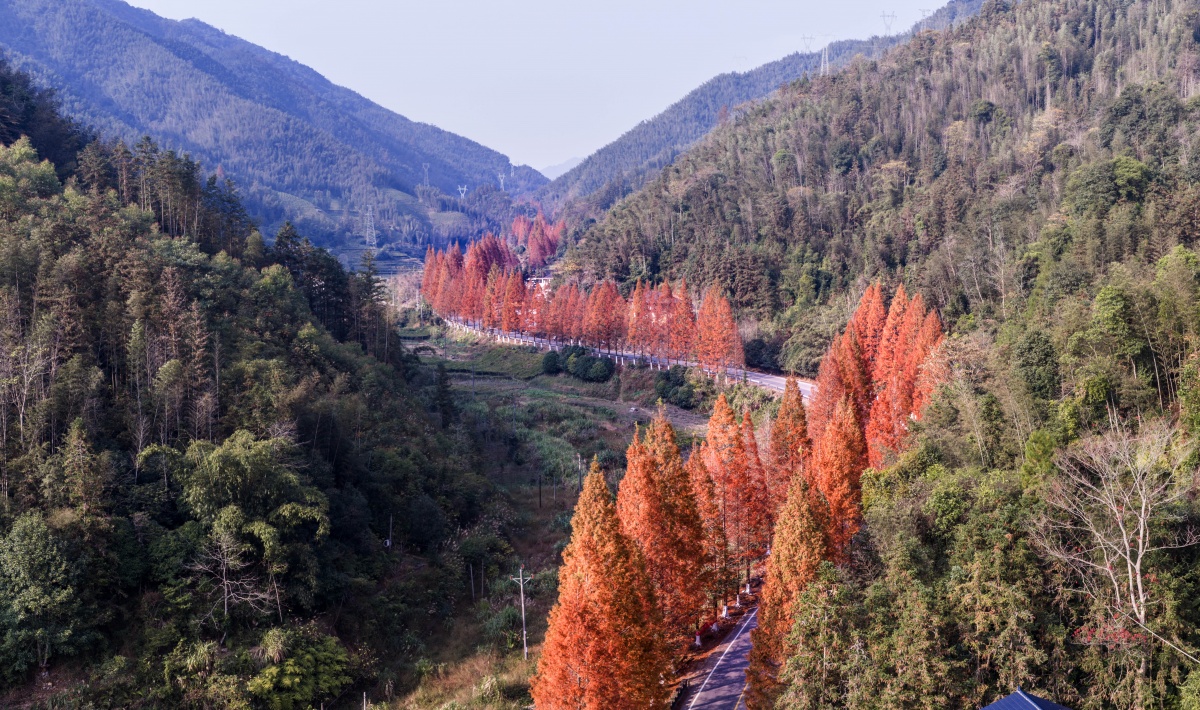 渐红的水杉为蜿蜒的公路增添了一道亮丽风景线。