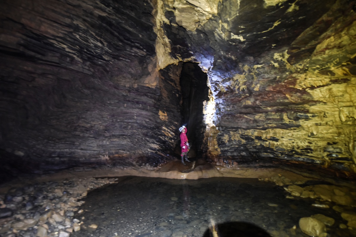 这个洞穴的第一层是旱洞,主洞道直径4—6米,高约8—10米。往前行进了200米,洞道陡然下切,形成断崖,缩小为仅容一个人下降的竖洞通道。