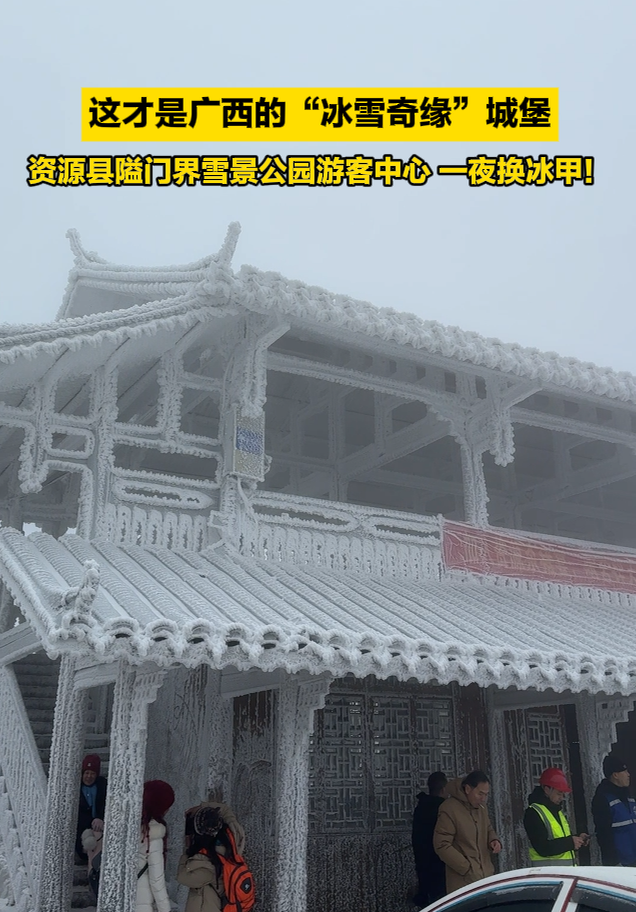 受持续低温影响 ,桂林市资源县隘门界雪景公园游客中心经整夜凝冻 化身为晶莹剔透的“雾凇楼”。木质建筑被冰凌雾凇轻柔包裹,冰枝玉树与古朴木楼相映,宛如童话幻境,引得游客纷纷驻足拍摄这一冬季限定奇观。