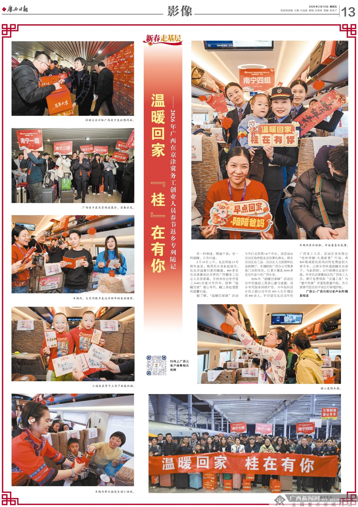 2月10日上午,北京西站13号候车室里,熟悉的乡音此起彼伏,处处洋溢着归家的暖意。400多名在京津冀地区打拼的广西籍务工创业人员及家属,手持身份证有序登上G421次复兴号列车,搭乘“温暖回家”爱心专列,踏上奔赴团圆的温馨归途。