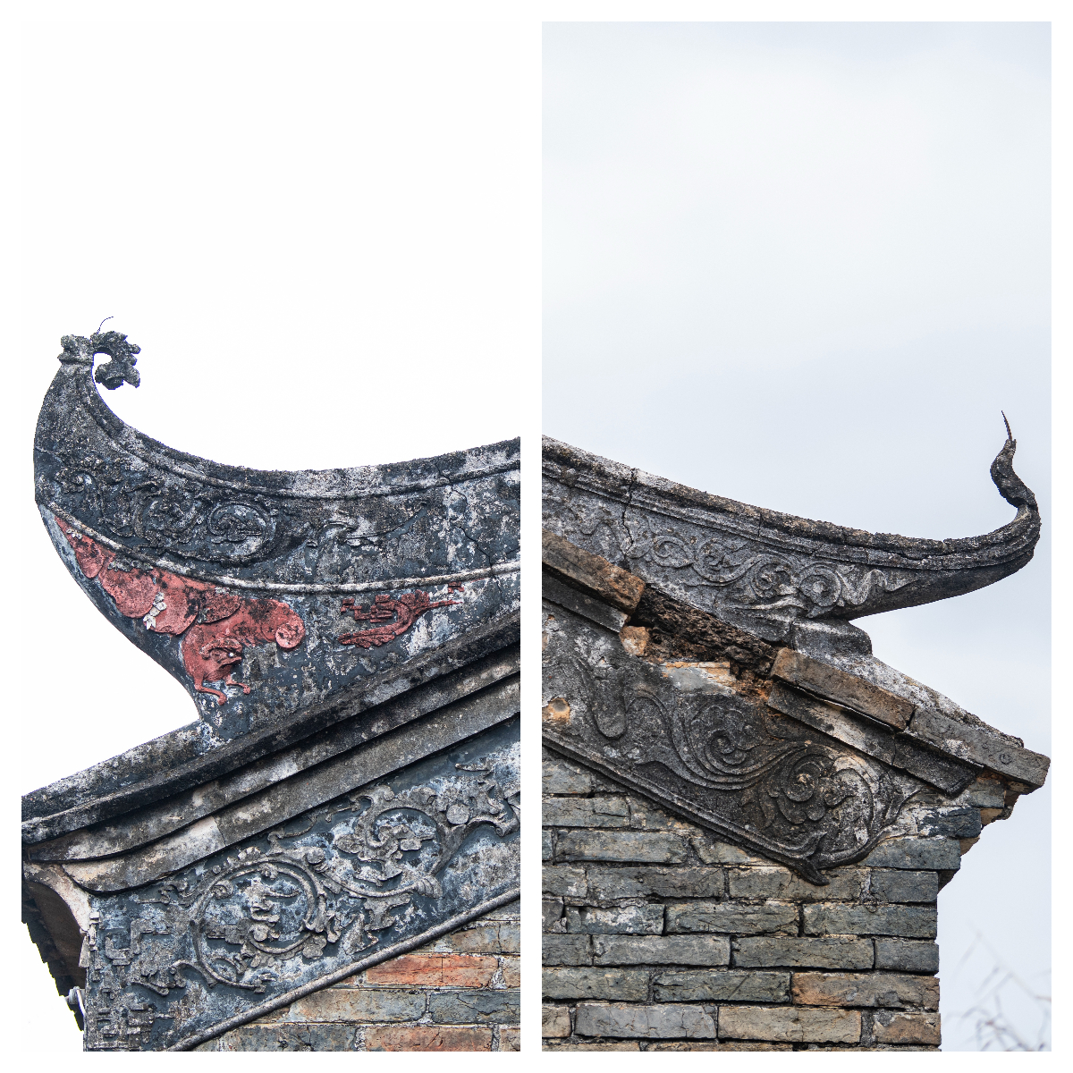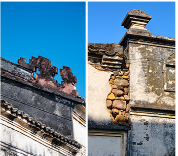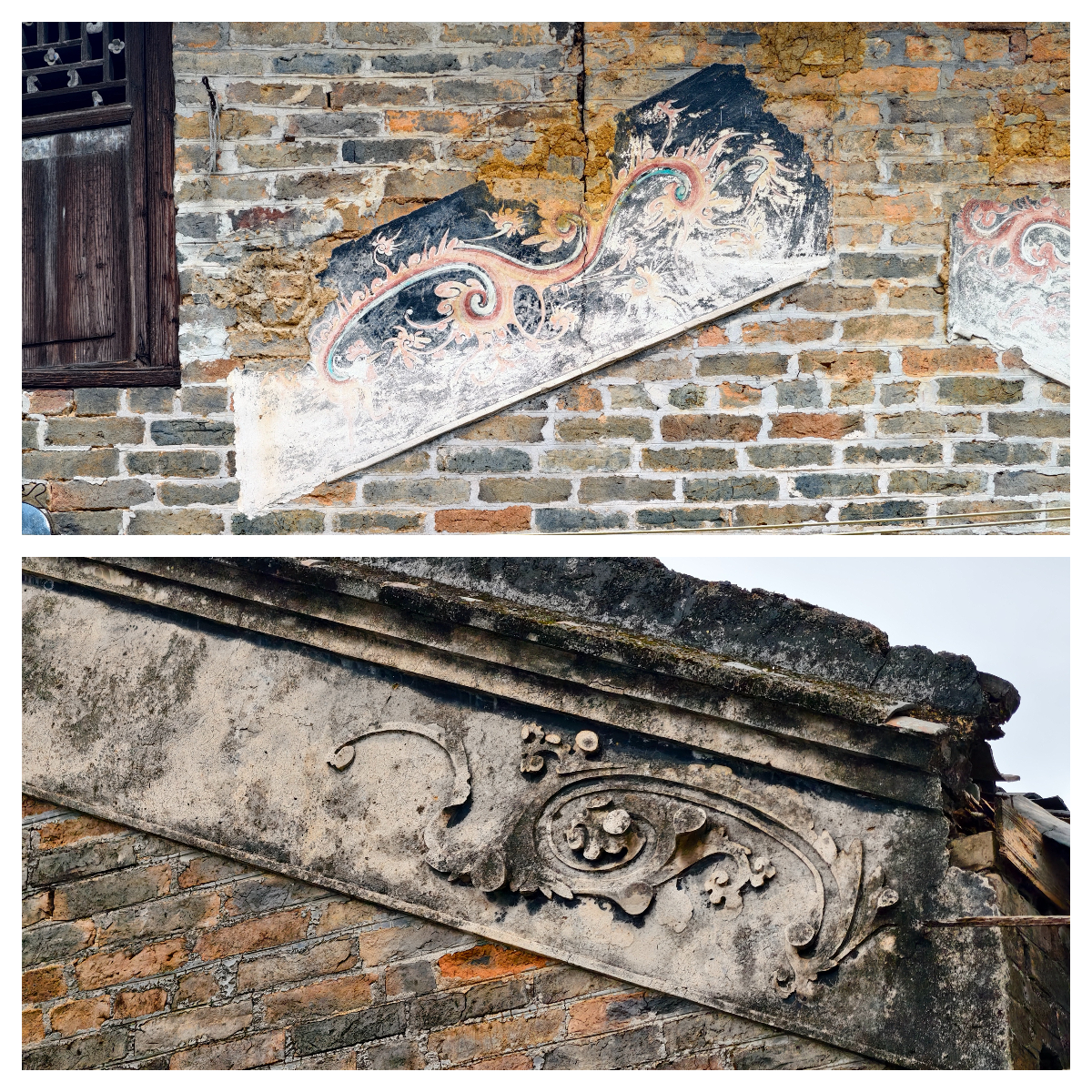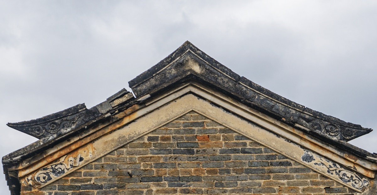 纳禄村古建筑的镬耳山墙局部,残存的装饰纹样尽显沧桑。
