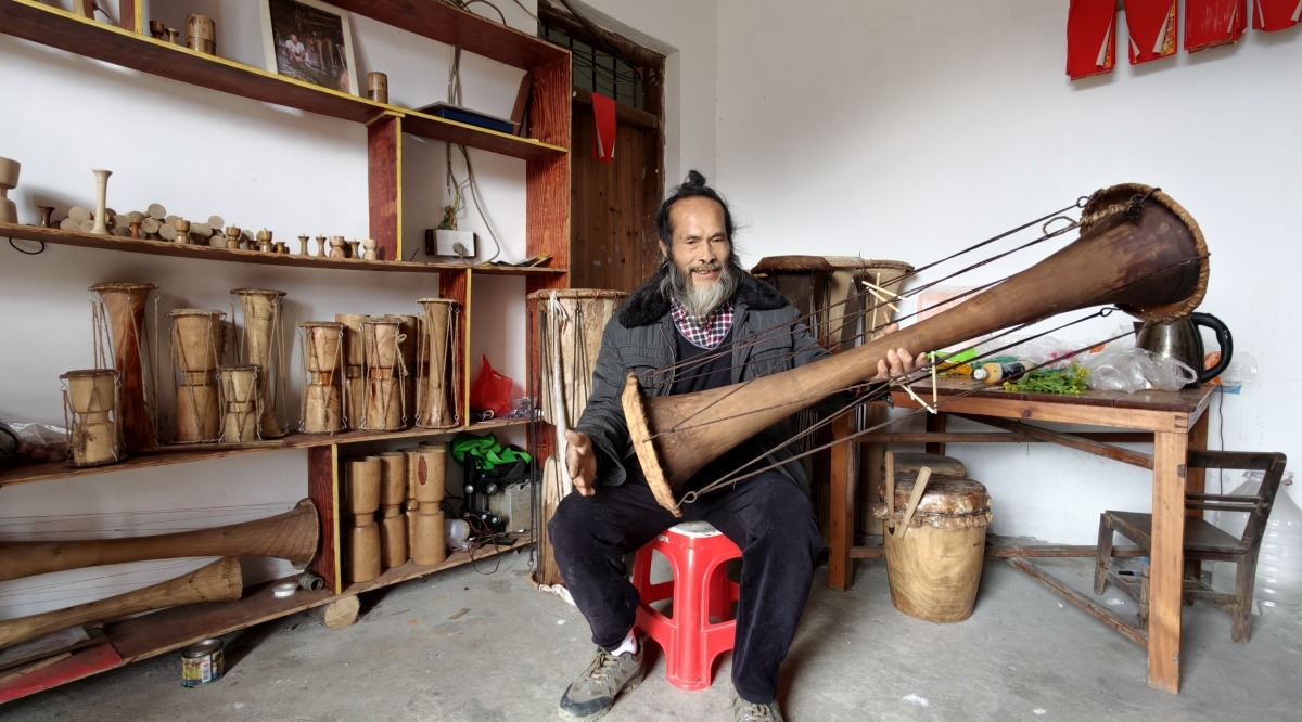 当地黄泥鼓舞非遗传承人展示黄泥鼓。