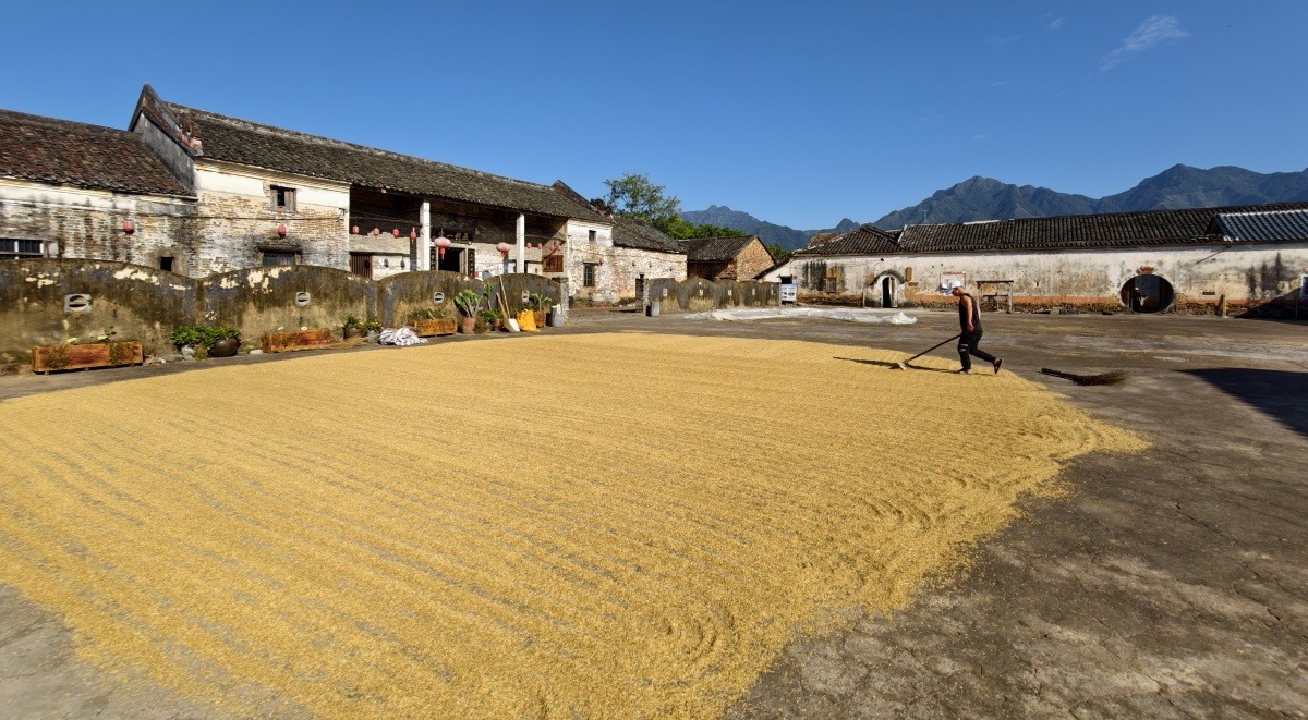 常有村民在古宅前晾晒稻谷。