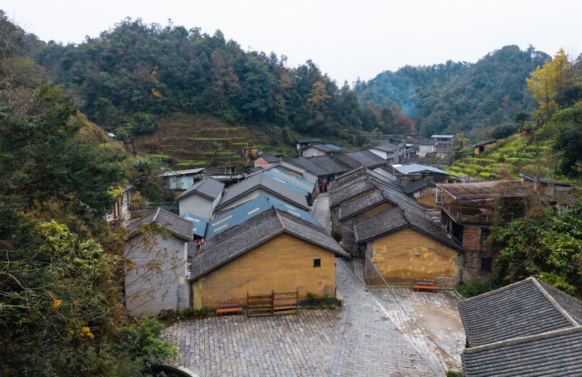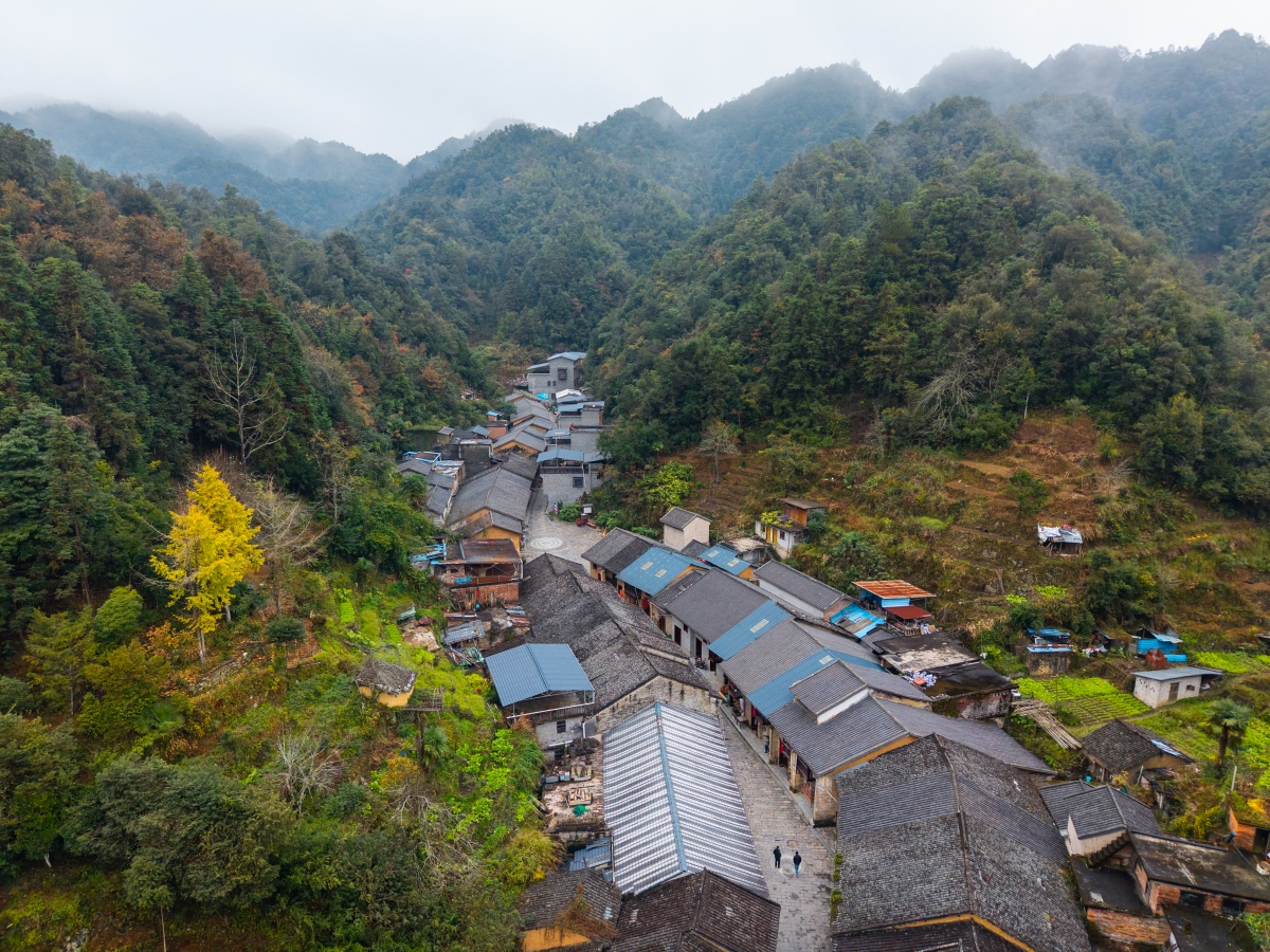 百年坳瑶古寨依山铺展。