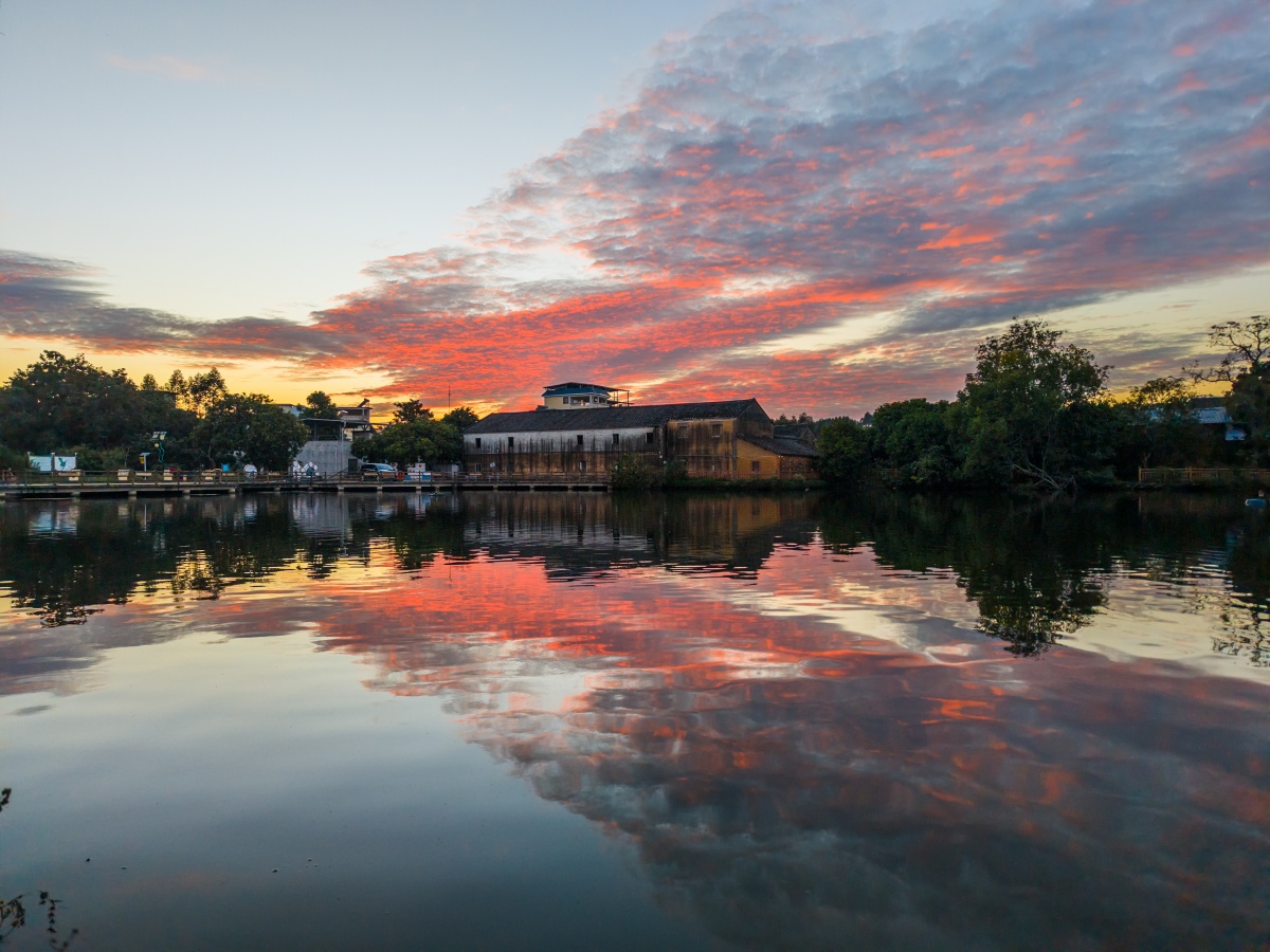 永安村一处古宅前,一池清水映晚霞。