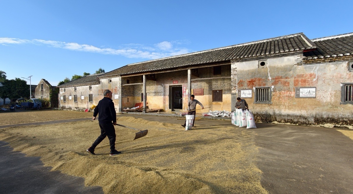 晴日里,村民利用古宅前空地晒谷。
