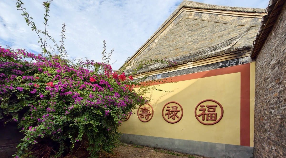 建筑外墙镶嵌“福”“禄”“寿”“喜”装饰,寓意吉祥。