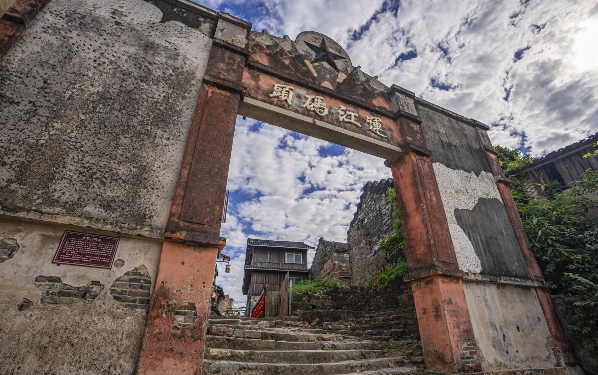 古镇里还保存了一座码头。村民介绍说,当年码头从早到晚车水马龙、人头攒动,过往商旅川流不息。如今,昔日热闹场景不再,通向河边的门口早已斑驳,墙上还有一些当年运输时的印记。