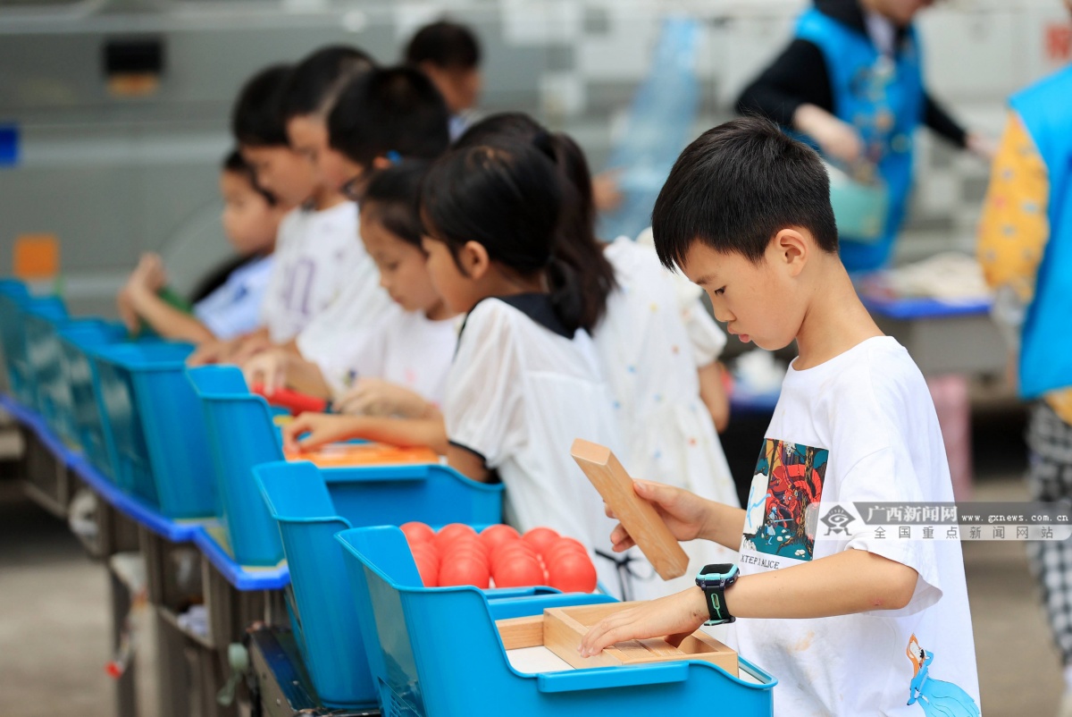 7月17日,在广西柳州市融安县泗顶镇中心小学校园,科技志愿者带领孩子们做空气压力游戏。谭凯兴 摄