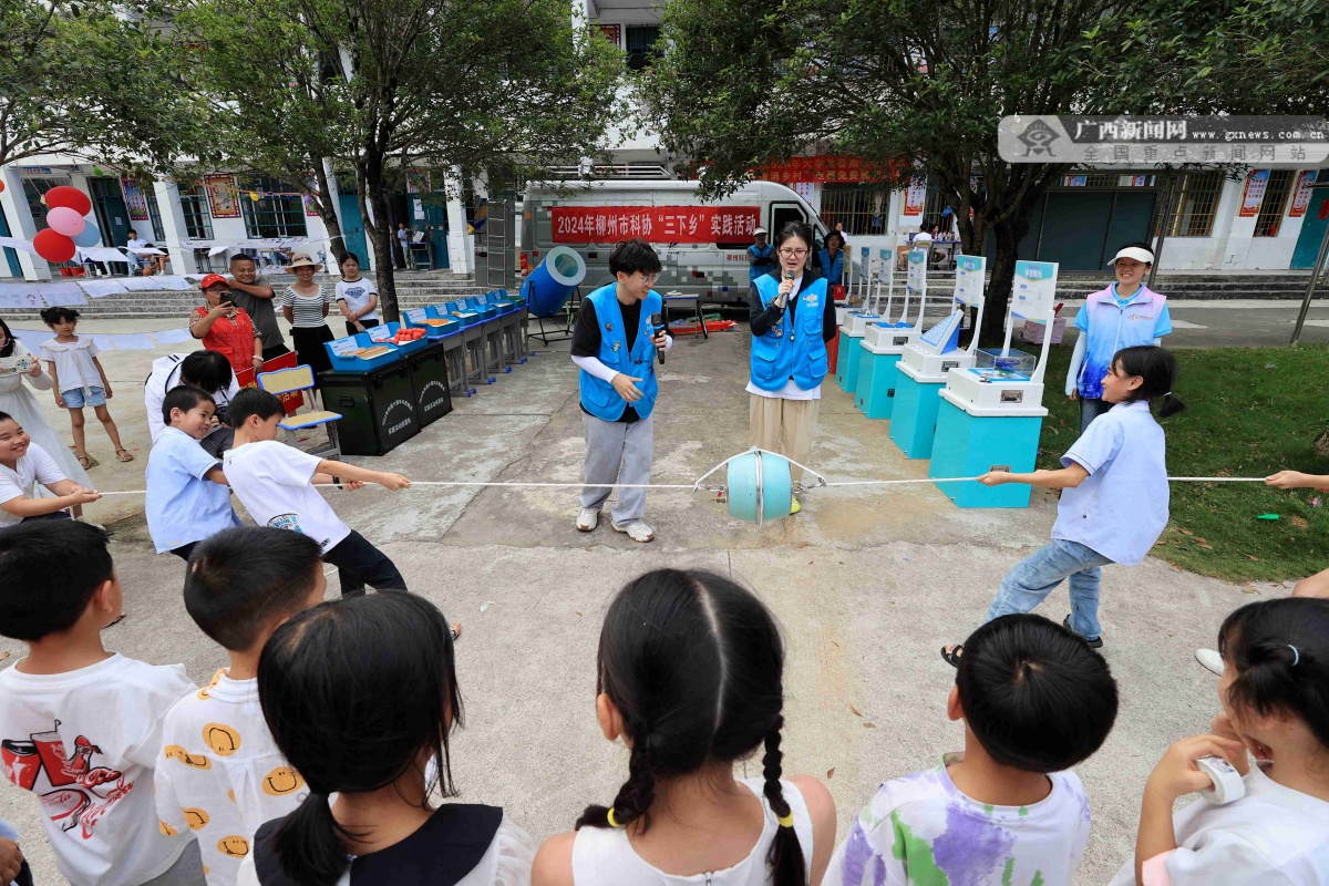 当日,主题为“科普梦·乡村情”2024年柳州市科协、柳州科技馆、广西科技大学“三下乡”实践活动在广西柳州市融安县泗顶镇中心小学举行。柳州科技馆的科技大篷车开进偏远山区校园,让山区留守儿童近距离感受科技大篷车带来的五彩缤纷的“科技世界”,通过零距离接触科普知识,科技产品展示、科学原理讲解、科学现象演示等,让山区留守儿童开阔视野,培养崇尚科学的良好风尚,感受科学的神奇与魅力,体验科技知识带来的乐趣,了解科学、认识科学、热爱科学,过一个有意义的暑假。