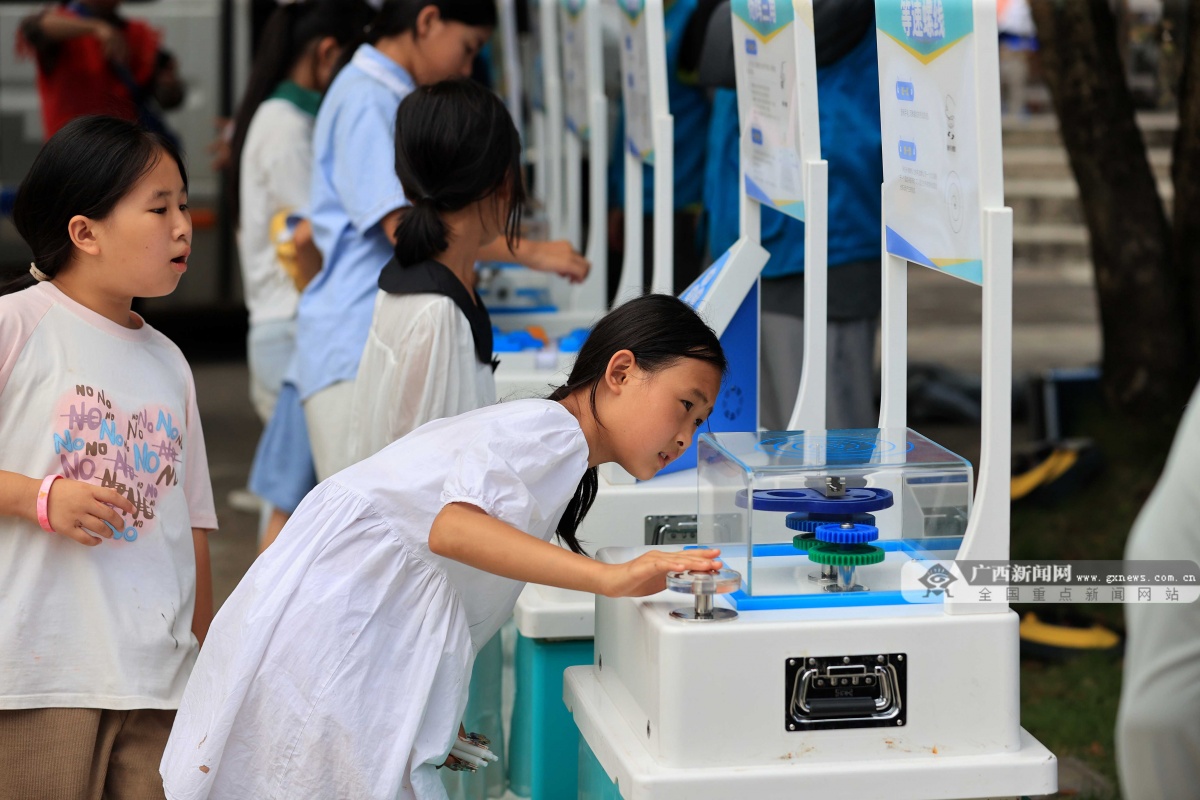 广西新闻网柳州7月18日讯(通讯员 谭凯兴 覃庆和)7月17日,在广西柳州市融安县泗顶镇中心小学校园,孩子们近距离接触科技展品。