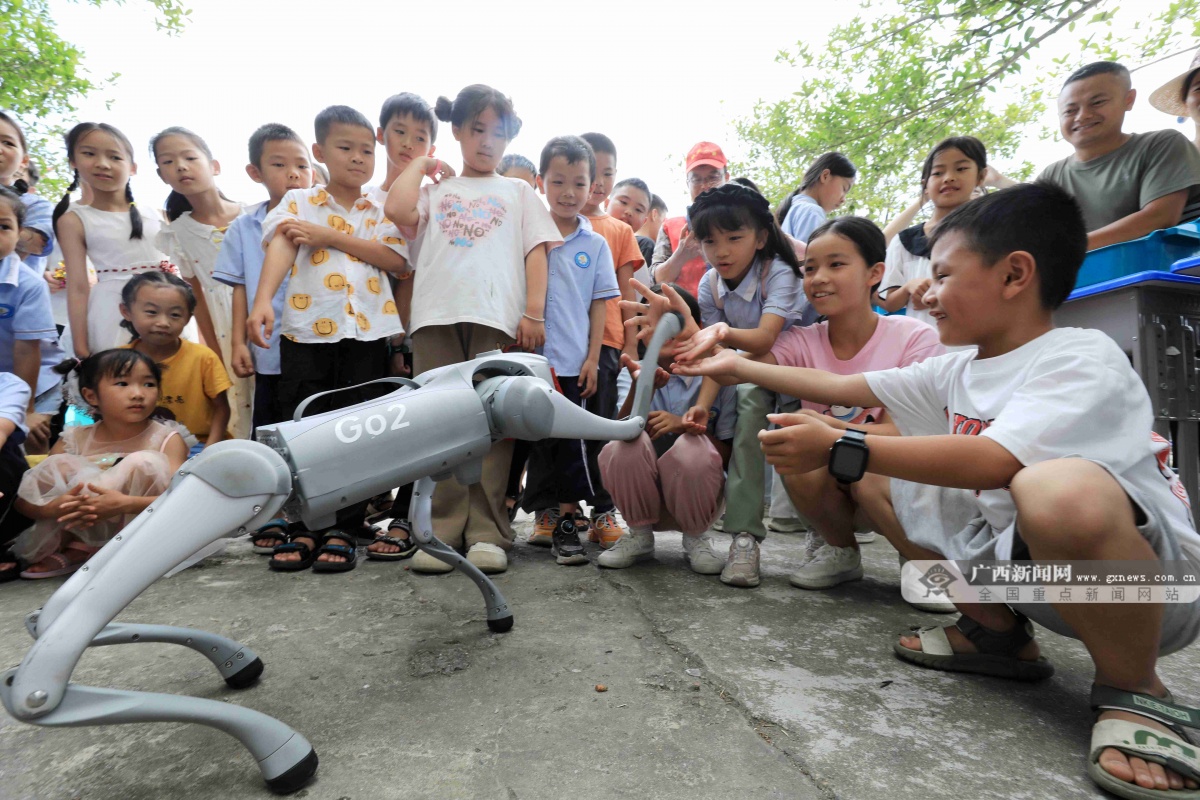 7月17日,在广西柳州市融安县泗顶镇中心小学校园,孩子们与机器狗互动。谭凯兴 摄